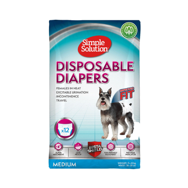 • No Mess - Simple Solution Disposable Dog Diapers have a leak-proof fit that gives your dog freedom of movement without compromising on security. The tail-hole and extra-long wings help them stay put on the wiggliest of dogs. For extra added protection use with Simple Solution Disposable Liners
