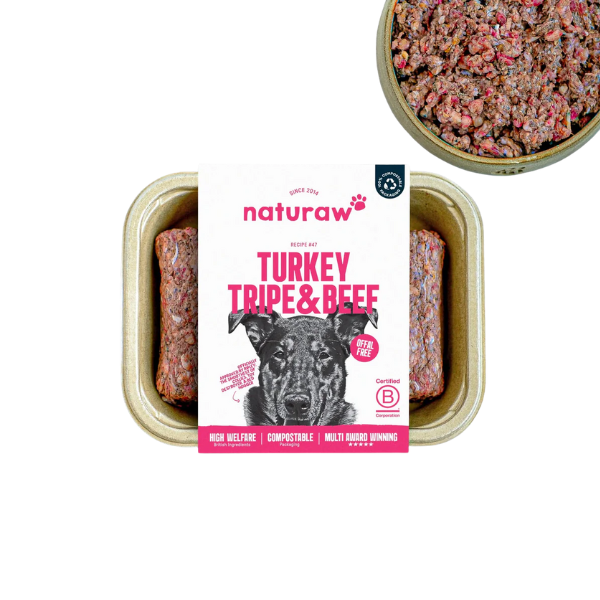 Exceptional Raw Dog Food This is what real dog food looks like, just high quality 100% British meat with no additives or preservatives in sight. Totally grain free, it's what dogs were born to be fed. INGREDIENTS 65% British Beef Meat (Tripe & Meat Chunks), 35% Free Range British Turkey...