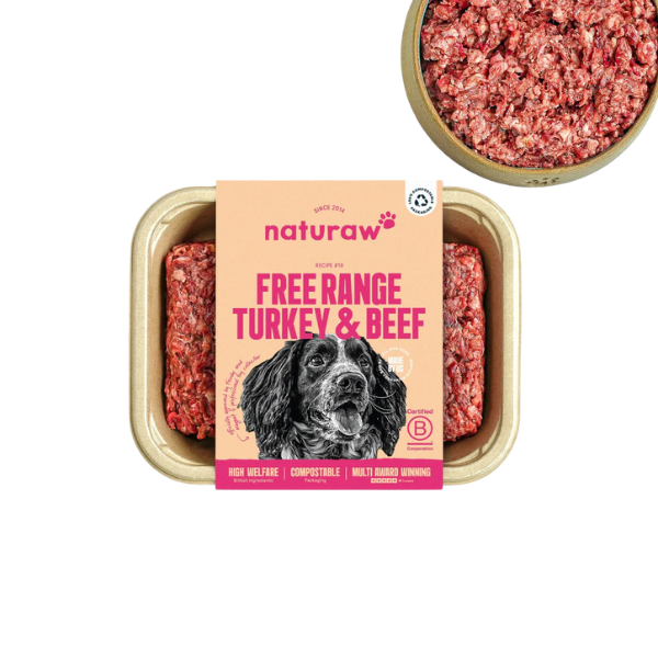 Exceptional Raw Dog Food This is what real dog food looks like, just high quality 100% British meat with no additives or preservatives in sight. Totally grain free, it's what dogs were born to be fed. INGREDIENTS 55% Boneless British Beef (Meat Chunks & Heart), 35% Free Range British Turkey...
