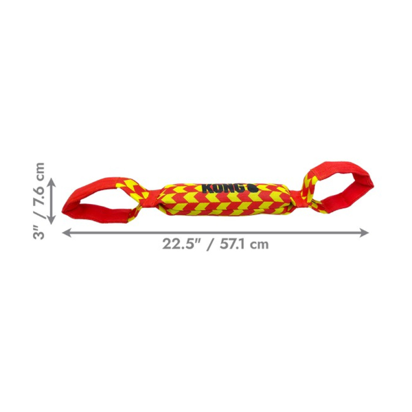 KONG MAXX Tug is rugged, durable, and made for energetic play sessions. This interactive tug toy is engineered for strength, with durable seatbelt material and two padded handles for extreme rounds of tugging, thrashing, and fetching. Inner crackle material and a squeaker keep dogs engaged for extended play sessions. Up to 5x stronger than typical plush toys, this tug is made for extreme fun.